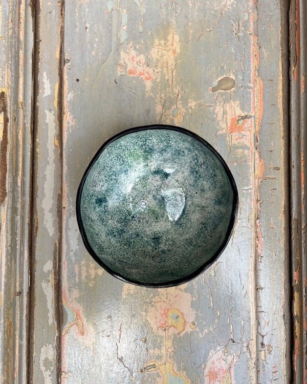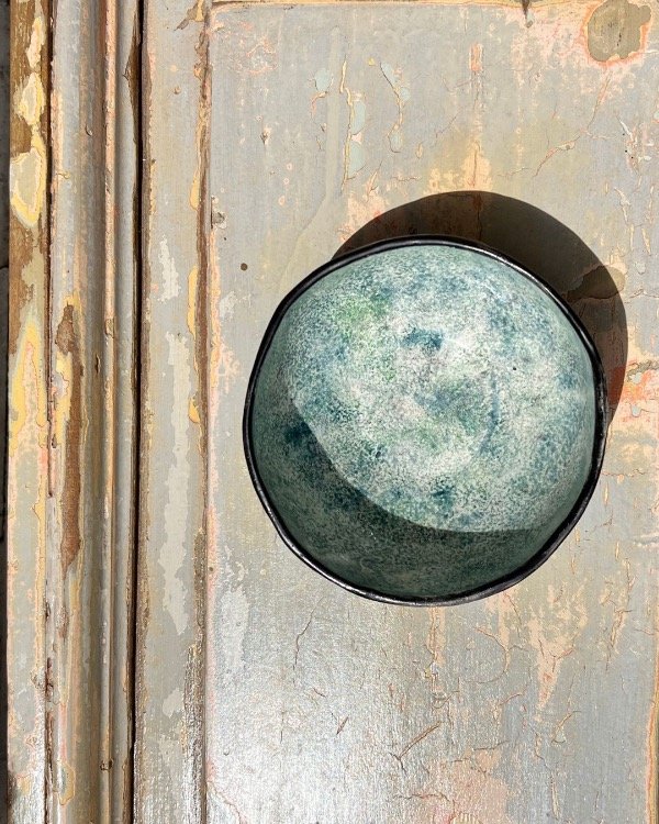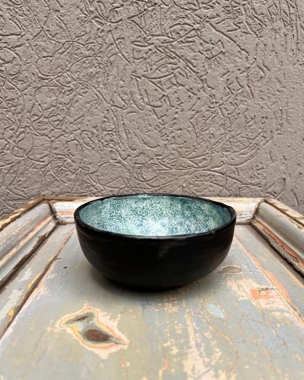 Color del esmalte: Negro mate por fuera y texturizado efecto esponja en azules, verdes y violetas.